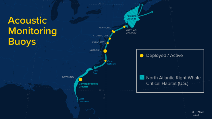 A network of acoustic monitoring buoys aims to help protect North Atlantic right whales—one of the world’s most critically endangered species—from ship strikes along the U.S. East Coast.