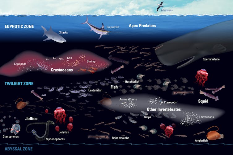 Top predators such as whales, tuna, swordfish and sharks rely on the twilight zone for food, diving down hundreds or even thousands of feet to catch their prey. Eric S. Taylor /© Woods Hole Oceanographic Institution
